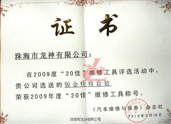 2010年北京汽保春季展期間,由中國(guó)汽車(chē)保修設(shè)備行業(yè)協(xié)會(huì)和《汽車(chē)維修與保養(yǎng)》雜志共同舉辦的2009年度“20佳”維修工具頒獎(jiǎng)典禮,于2010年3月18日在北京江河水鳥(niǎo)巢麗景隆重舉行,龍神“鈑金快修套裝”在眾多候選產(chǎn)品中脫穎而出,獲得本屆評(píng)審委員會(huì)專(zhuān)業(yè)評(píng)委的一致認(rèn)可:符合產(chǎn)品創(chuàng)新性、實(shí)用性、效率性,可幫助企業(yè)提高工作效率,授予“中國(guó)汽車(chē)維修市場(chǎng)2009年度20佳”榮譽(yù)稱(chēng)號(hào)。