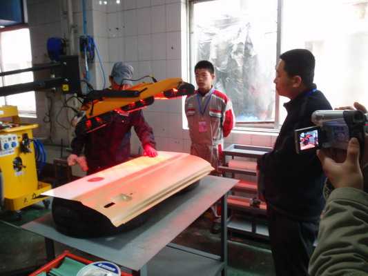 參賽選手利用龍神公司提供的鈑噴設(shè)備進(jìn)行實(shí)操